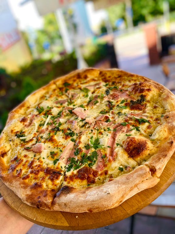 ser, gyros, szynka, papryka, kukurydza, parmezan, sos czosnkowy -